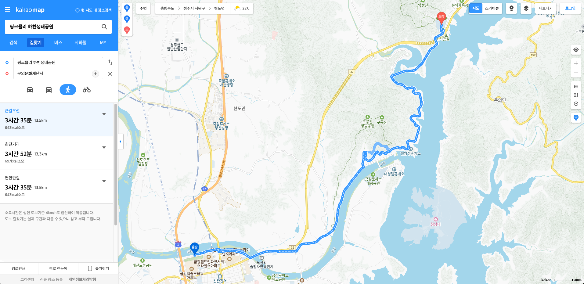 그래서 당장 내일부터 나를 찾아 떠나는 여행, 나만의 순례 준비를 시작하려고 한다. 일단 내일은 1일차이므로 테스트 걷기를 해보려고 한다. 출발지는 "핑크뮬리 하천생태공원"이고 도착지는 "문의문화재단지"이다. 카카오맵 기준, 편도 13.5km 이고 예상소요시간은 3시반 30분이다. 그래서 왕복 27km, 7시간 목표로 걸어보려고 한다.